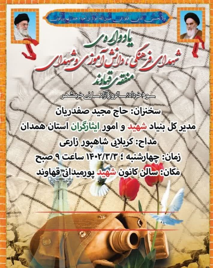 به گزارش کمیته فرهنگیان و دانش آموزی دومین کنگره 8000 شهید استان همدان، به مناسبت در پیش بودن سوم خرداد و سالروز آزادسازی خرمشهر، یادواره شهدای فرهنگی ، دانش آموز...