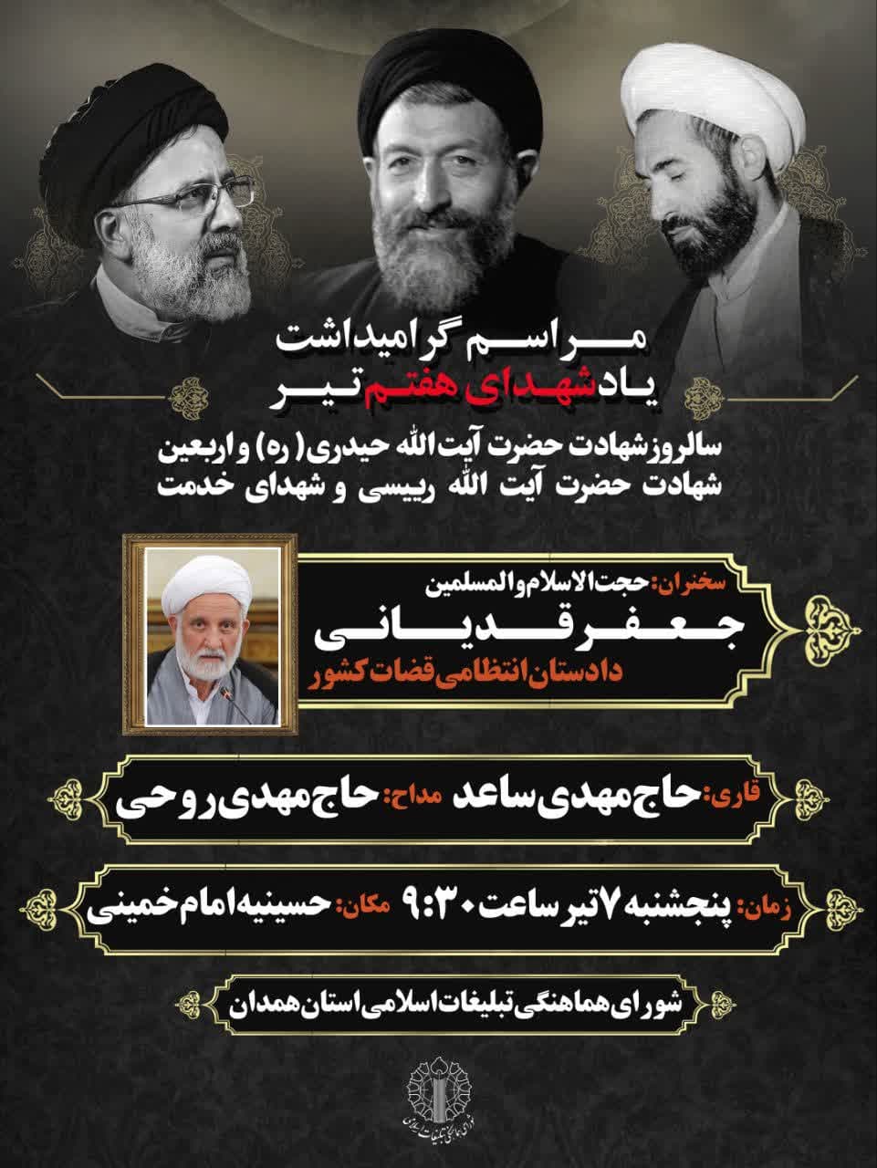 سخنران: حجتالاسلاموالمسلمین جعفر قدیانی؛ دادستان انتظامی قضات کشور ▫️زمان: پنج شنبه ۷ تیر ساعت ۹:۳۰ ▫️مکان: همدان، خیابان پاسداران، حسینیه امام خمینی(ره)