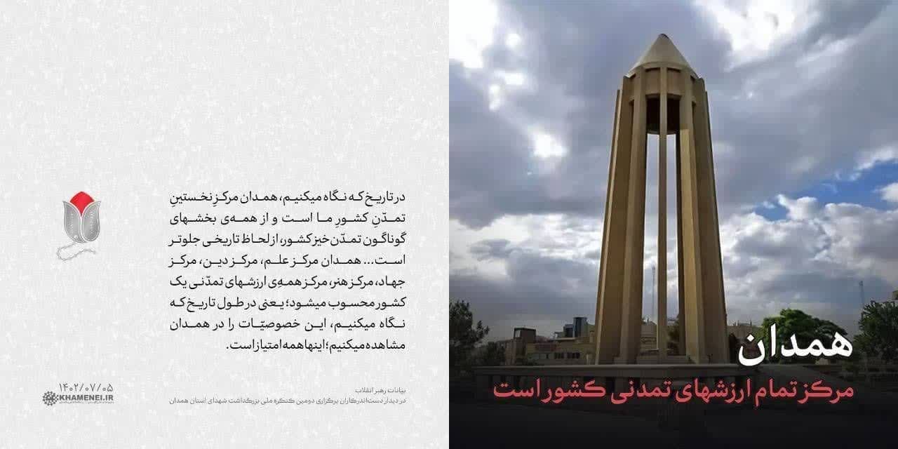 ✏️ رهبر انقلاب: در تاریخ که نگاه میکنیم، همدان مرکزِ نخستینِ تمدّنِ کشورِ ما است و از همهی بخشهای گوناگون تمدّنخیز کشور، از لحاظ تاریخی جلوتر است… همدان مرکز علم،...