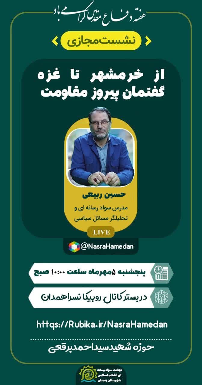 سخنران: حسین ربیعی؛ مدرس سوادرسانه ای و کارشناس مسائل سیاسی روز ▫️زمان: پنجشنبه ۵ مهرماه ۱۴۰۳؛ ساعت ۱۰ صبح ▫️مکان: کانال روبیکا نسرا همدان ▫️آدرس: https://rubika.ir/NasraHamedan