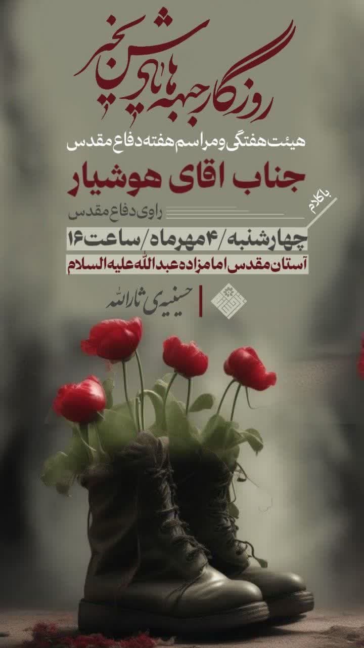 باکلام راوی دفاع مقدس؛ جناب آقای هوشیار ▫️زمان: چهارشنبه ۴ مهرماه ۱۴۰۳، ساعت ۱۶ ▫️مکان: همدان، حسینیه ثارالله، آستان مقدس امامزاده عبدالله علیهالسلام