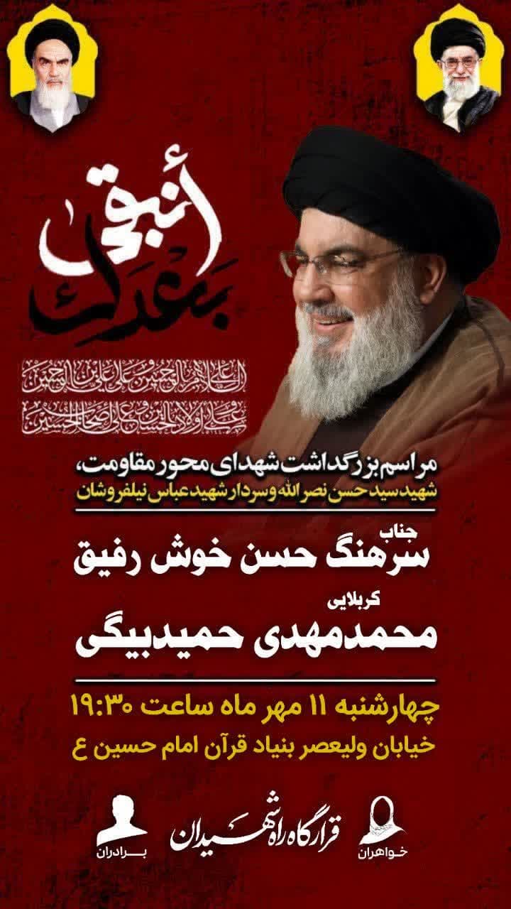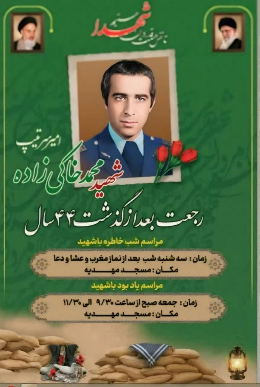 ▪️مراسم شب خاطره با شهید خاکی زاده: ▫️زمان: سهشنبه ۱۰ مهرماه ۱۴۰۳؛ همزمان با اقامه نماز مغرب و عشاء ▪️آیین تشیع پیکر: پنج شنبه ۱۲ مهر ساعت ۱۰ میدان امام...