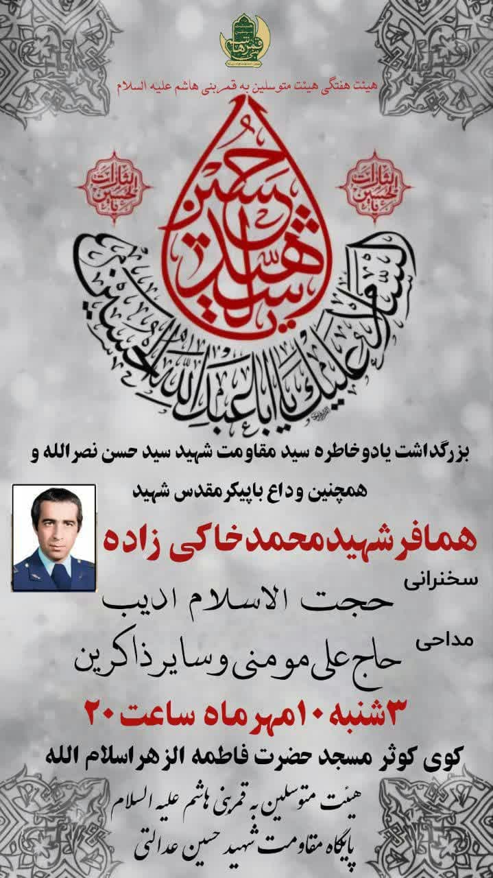 باکلام: جناب سرهنگ حسن خوش رفیق فرمانده گردان ۱۶۵ امام حسین علیه السلام شهرستان بهار باحماسه خوانی: کربلایی محمـدمهدی حمیدبیگی ▫️زمان: چهارشنبه ۱۱ مهرماه؛ ساعت ۱۹:۳۰ ▫️زمان: لالجین، خیابان ولیعصر(علیه...