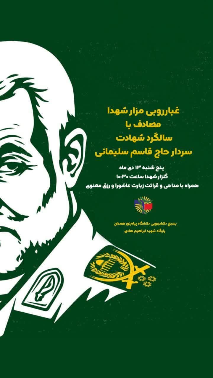 🔻همراه با مداحی و قرائت زیارت عاشورا و رزق معنوی ⏰زمان: پنجشنبه ۱۳ دیماه؛ ساعت ۱۰:۳۰ 📍مکان: همدان، گلزار شهدا