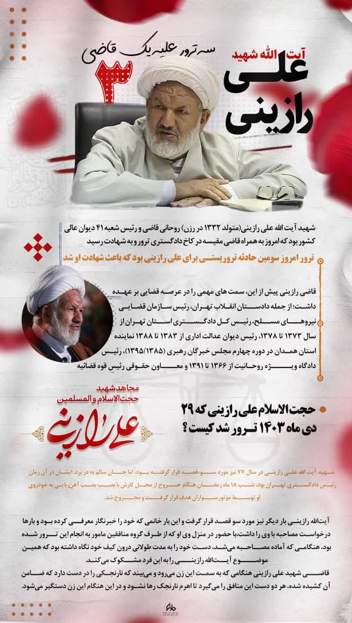 #اینفوگرافیک | سه ترور علیه یک قاضی ▪️حجت الاسلام علی رازینی که امروز ترور شد، کیست؟ #قضات_ضدتروریسم #شهدای_همدان #شهیدعلیرازینی 🆔@shohadayehamedan