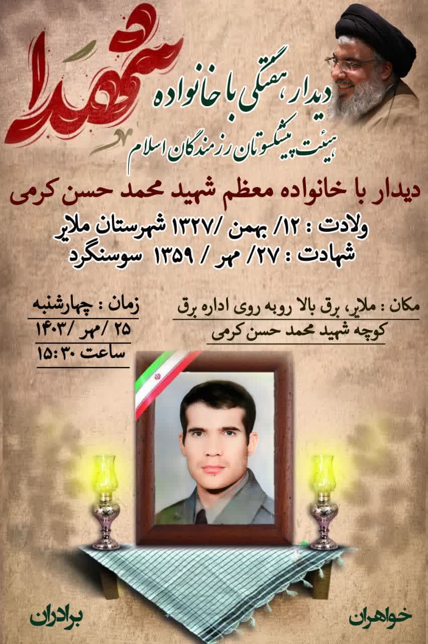 ▫️زمان: چهارشنبه ۲۵ مهرماه ۱۴۰۳؛ ساعت: ۱۵:۳۰ ▫️مکان: ملایر، برق بالا، روبروی اداره برق، کوچه شهید محمدحسن کرمی