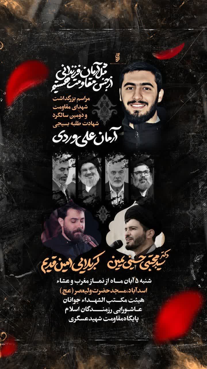 سخنران: حجت الاسلام والمسلمین سید مجتبی حسینی یمین با نوای: کربلایی امین قدیم ▫️زمان: شنبه ۵ آبانماه ۱۴۰۳؛ از نماز مغرب و عشا ▫️مکان: اسدآباد، مسجد حضرت ولیعصر (عج)
