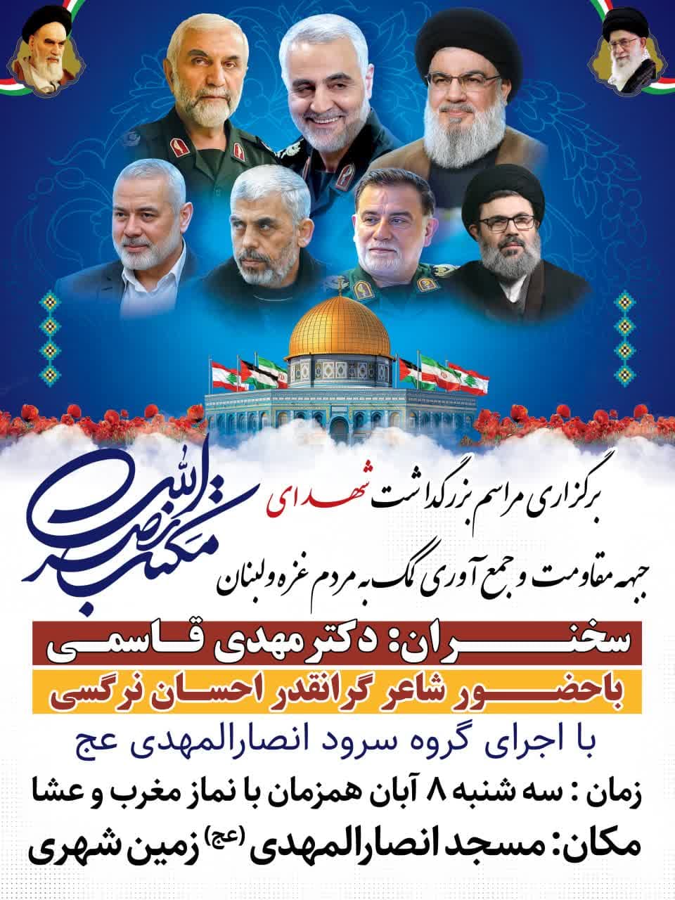 سخنران : دکتر مهدی قاسمی باحضور شاعر ارزشی احسان نرگسی و اجرای گروه سرود انصارالمهدی عج ▫️زمان: سه شنبه ۸ آبانماه ۱۴۰۳؛ همزمان با نماز مغرب و عشاء ▫️مکان: همدان،...